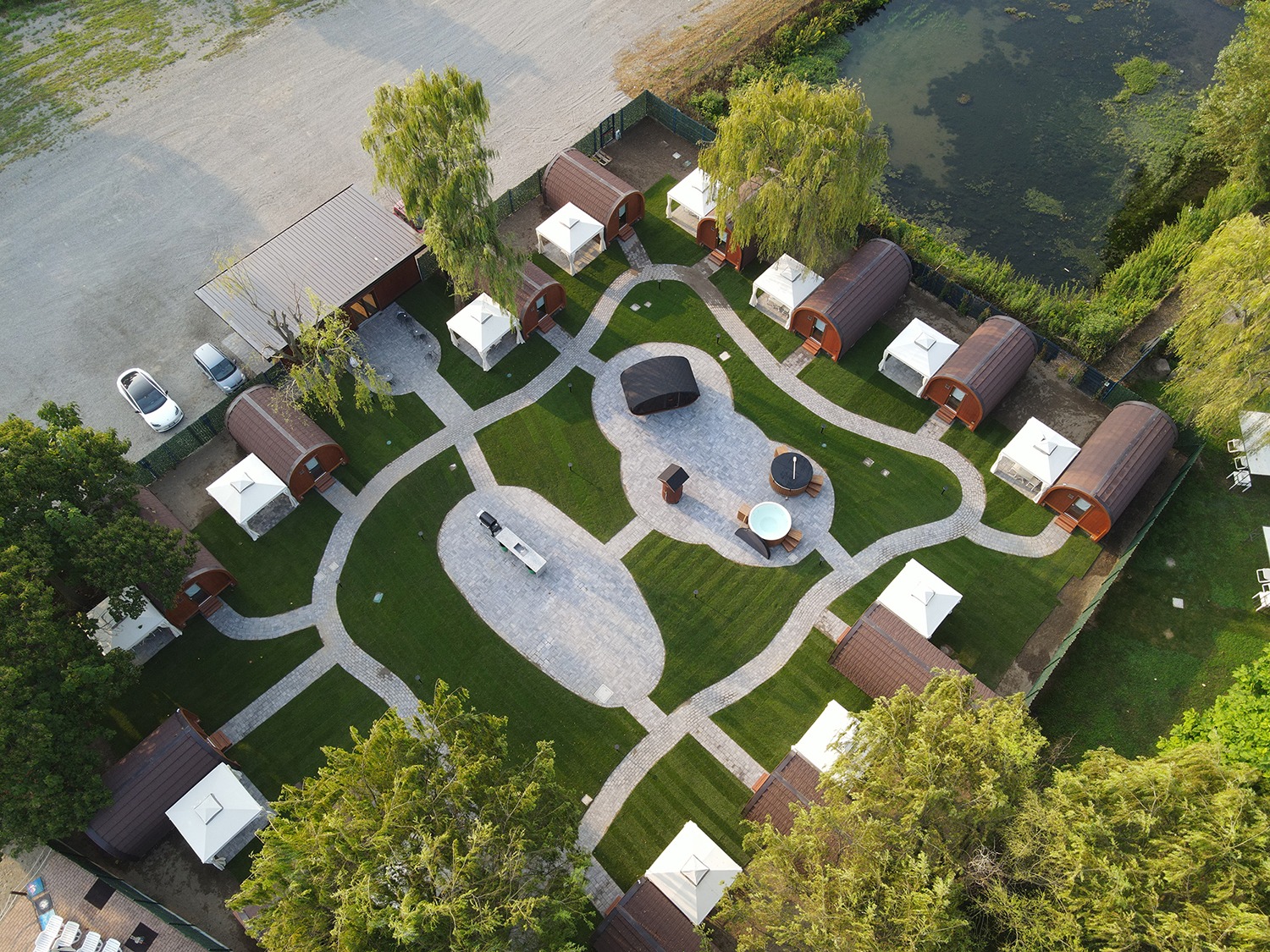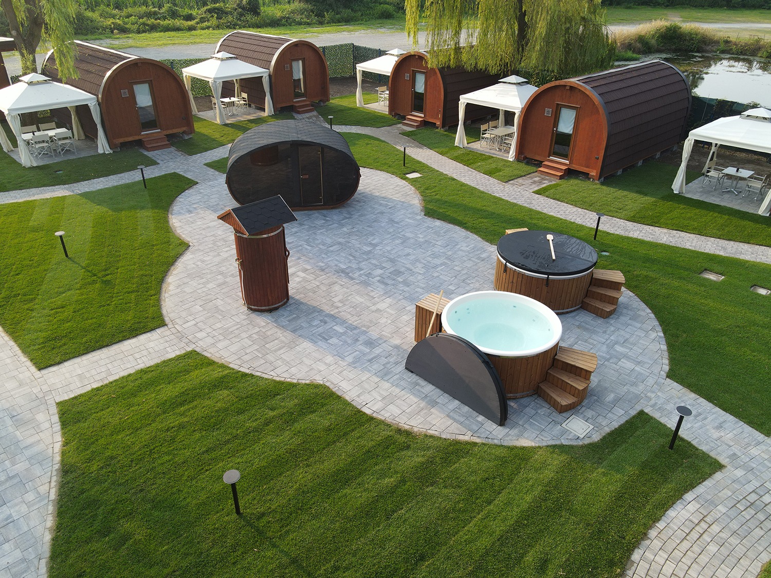 - 14 luxurious, elegantly furnished wooden lodges, with private bathroom, air conditioning, fridge in the room, coffee machine, interactive TV, private outdoor patio with gazebo and furniture